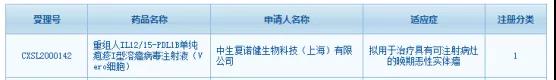 武漢濱會(huì)生物科技的重組人GM-CSF溶瘤II型單純皰疹病毒(OH2)注射液(Vero細(xì)胞)聯(lián)合PD-1/L1治療不可手術(shù)切除,標(biāo)準(zhǔn)治療失敗的晚期實(shí)體瘤(如乳腺癌、黑色素瘤、頭頸癌、軟組織肉瘤、肝癌或肝轉(zhuǎn)移瘤等)的治療。