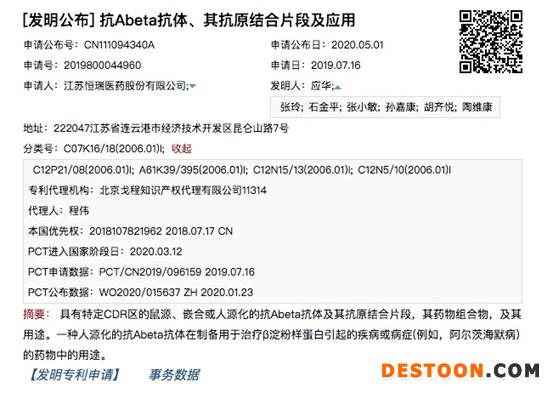 不過(guò),Aducanumab還是沒(méi)能逃過(guò)前輩們的宿命。2019年3月,渤健宣布終止Aducanumab的III期臨床試驗(yàn)。彼時(shí)恒瑞實(shí)驗(yàn)室對(duì)于Aβ的研究已經(jīng)是如火如荼,接近提交成果的時(shí)刻,4個(gè)月后恒瑞在國(guó)家知識(shí)產(chǎn)權(quán)局提交的專(zhuān)利申請(qǐng)通過(guò)。