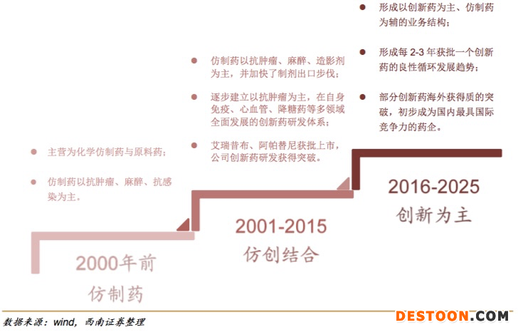 復(fù)盤(pán)恒瑞近30年的發(fā)展歷史,其研發(fā)歷程分為三個(gè)階段: